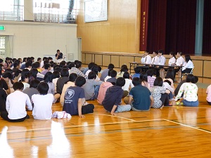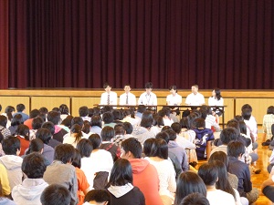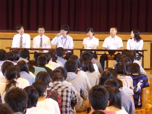 本日、7限目の総合学習の時間に、「教育実習生の話を聴く会」を2年生対象に催しました。5月26日(月)から7名の卒業生が教育実習にきています。本日話をしてくれた6名の実習生は、「高校時代の生活」、「進路について考えたこと」、「大学生活」、「下宿生活について」、「効果的な勉強方法」等の司会の先生からの質問に答えました。その中で、「部活と勉強は両立できる」、「下宿生活をしてみて初めて親のありがたみがわかった」などの話がありました。 最後は「何かやりたいことを見つけてください。そうすればやりたくないことを乗り越えられる」、「第一志望をあきらめない」等、後輩に熱い思いを語ってくれました。