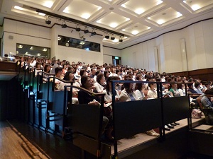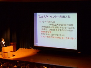 3年生の保護者対象の進路説明会を人権センターで10時から行いました。180名ちかくの保護者の方が参加されました。進路指導部主任から@今年度の入試結果 A大学合格得点 B入試のスケジュール C入試の仕組みについて、3学年主任からは@3年生の現在の様子 A保護者の心得等について話がありました。 いま大切なこととして次のような話がありました。 「本校の生徒は受験の後半に成績が伸びる傾向にある。早い時期に大学を決めてしまうと、本来もっている子どものたちの能力を生かせずに終わってしまいかねない。1 今の判定を気にしない。 2 自分を信じてひたすら勉強する。3 子どもを信じて、支える。4 「勝負の夏」「忍耐の秋」「花さく冬」 学校としても家庭の支えのもと、一人一人の生徒の希望、夢が実現できるように取り組んでいきます。