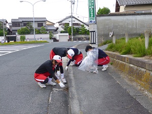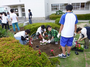 校内ではバラ園の雑草を抜いたり、藤棚の前の花壇に花の苗を植えたりしました。校外では通学路を中心にゴミを拾ったり、雑草を抜いたりしました。 美化活動の最後にはPTAからの差し入れのスポーツ飲料が参加した生徒に配られました。
