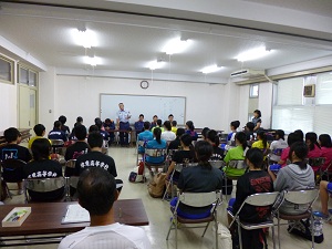 本日13時30分から津北消防署の方を講師に招き、「救急救命講習」を会議室で開催しました。例年、夏季休業に入る直前のこの時期に、熱中症や緊急を要する場合等に適切に対処できるように行っています。今回もそれぞれの運動部の代表、計40名の参加がありました。