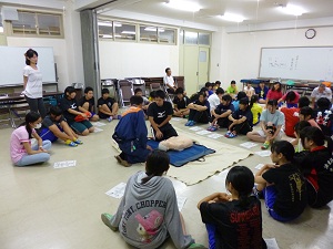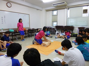 最初、消防署の方から熱中症についての対処方法、続いて心肺蘇生法について説明がありました。 説明後、グループに分かれて、人形を使ってのAEDの講習を受けました。 もうすぐ夏休みです。本日学んだことを部員に伝達し、安全意識を高め、事故・怪我のない活動をしてほしいと思います。