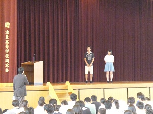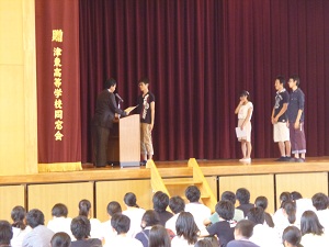 また終業式に先立って、部活動の表彰式、クラスマッチ表彰式、全国大会・東海大会出場のフェンシング部と陸上部の壮行式が行われました。