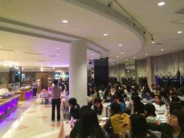 1階、レストランで夕食です。会場のスペースの関係で、2クラスずつ、時間をずらしての夕食となりました。