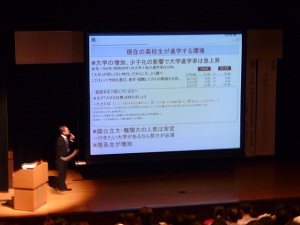11月1日(土)、三重県人権センター多目的ホールで、午前に2学年の保護者対象に、午後から1学年の保護者対象に進路説明会を実施しました。 2学年は進路指導部からの説明のあと、河合塾の次橋先生をお招きして、「受験生をスタートするにあたって」という演題で講演会を実施しました。その後は学年の方から最近の生徒の様子について話がありました。 1学年は同じく河合塾の次橋先生より「1年生保護者の方に心がけてほしいこと」という演題で講演の後、進路指導部、教務部、学年よりそれぞれ話がありました。 1・2学年とも多くの保護者の皆さまに参加していただくことができました。これからの受験の「サポート」や「準備と対策」など、今日の一日がいろいろな進路を考える一助になれば幸いです。