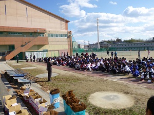 参加者はグラウンドに集合し、校長先生の挨拶の後、寒風の中、校内外の割り当てられた場所の作業に行きました。