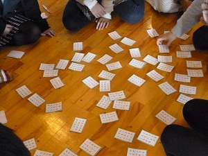 本日7限目のLHRの時間に1学年が、体育館において百人一首大会を実施しました。1組〜8組の同じ出席番号の人8人を1班とし、全部で40班に分かれて100枚の札をそれぞれの班で取り合いました。