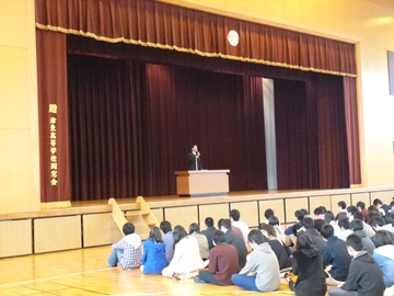 引き続き、始業式。松岡校長からの式辞。「決断する」ことをテーマに生徒に語りました。「決断とは『断つことを決める』と思われているが、語源は中国の故事に由来します。ある国の王が洪水の時、国を守るため河川の堤防をどこかを崩し、水を流すことを迫られました。水を流した先には村があり、どこの村を犠牲にするかを決めなければならなかったのです。新学年・新学期、みなさんが頑張り、何かを手に入れようとします。そのためには何かを犠牲にしたり、我慢したりしなければなりません。夢の実現に向けて何を我慢するのか、この機会に考えてください」 さらに、いまからでは遅いと考えている人に対して、こんな譬えを紹介しました。「年齢を3で割ると、一生を一日、24時間に置き換えることができるといいます。18歳のみなさんは3で割ると、6。まさに朝、起きたばかりの時間なのです」