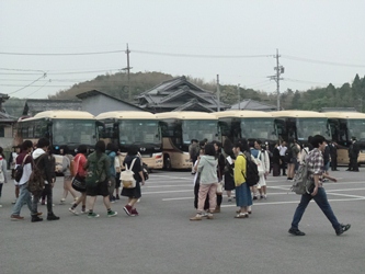 行き先は1年生は京都嵐山、2年生はナガシマスパーランド、3年生は名古屋白川公園。最も時間がかかる1年生が最初に出発し、10分おきに3年生、2年生の順で出発しました。