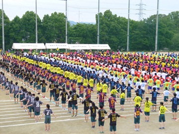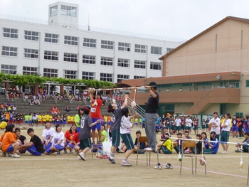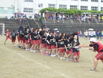「イチ、ニー、サン・・・」気持ちとタイミングを合わせるための大きなかけ声。本日の体育祭、最後の種目は大縄飛び。各学年、8クラスづつ3分間の中で、最高回数を競いました。体育祭直前の練習の成果を発揮でき、30回を超えるジャンプができたクラス、残念ながら数回に終わったクラスと結果は様々でしたが、これまでの最高回数にチャレンジしようという気持ちが伝わってきました。 本日の体育祭はいつ雨が降り出すか、気をもむ中で進行しました。「特活室には照る照る坊主が二つ、つり下げてありました。僕たちの気持ちで何とか天気をもたせることができました」と生徒会長挨拶で始まりました。