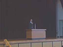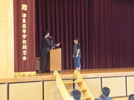 始業式後、新しく着任したALTの先生の紹介と、「おーい お茶」俳句募集で受賞した生徒の表彰がありました。