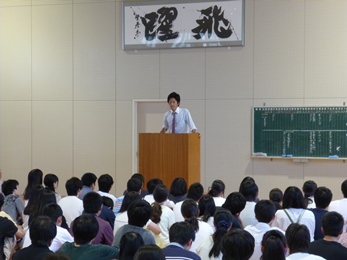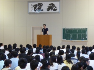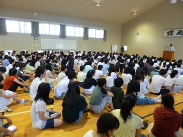 最初、進路指導部主任から「9月中旬のシルバーウィークには学年で勉強する取組があります。是非、参加してください」と夏休みからの学習を続けることと、「努力を続けるとセンター試験は確実に点数がアップします。ただし、夏の学習の成果がでるのは3ヶ月から4ヶ月後の10月から11月です」と焦らず我慢し続けることを3年生に訴えました。