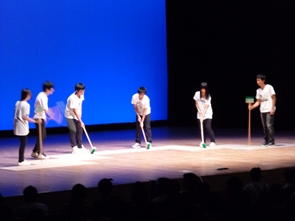 <中央>2年7組 STOMP・LIVE デッキブラシやドラム缶などを使って床やそのもの自体を叩き、ハーモニーを奏でました。