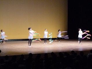 <右> 新体操部 Popcorn 1・2年の部員、引退した3年生、最後は全員で手具やゴースを使ってステージ一杯、弾けました。