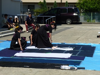 書道部。校舎前で「書道ガールズ」が音楽に合わせ、拡げた大きな紙にそれに見合う筆をもって、勢いのある「書」を披露。