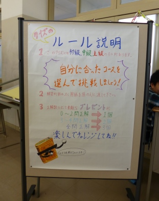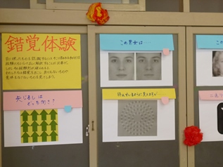 保健委員会。健康に関する諺、格言に関するクイズ。錯覚を体験したり、身体の歪みが分かるコーナーなど健康に関することを気軽に体感できる企画でした。