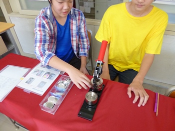 人権委員会。缶バッジを作るコーナーがメイン。学校生活が心地よく送るためや、人権が尊重される社会をつくるために、メッセージを4cm程の丸い紙に書き、その紙とバッチをプレスして、缶バッチを作るというもの。