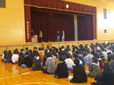 1月7日から3学期が始まりました。始業式に先立ち、生徒会グランプリの表彰式。生徒会グランプリとは、体育祭などの行事の結果や、ペットボトルキャップのふたを回収しワクチンに交換しアフリカなどに送る取組などを総合的に評価し、ランキングするものです。