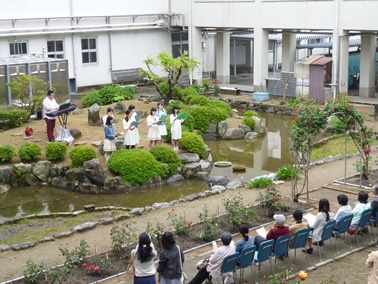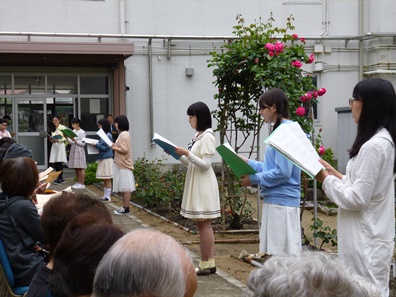 本日、11時から本校合唱部によるミニコンサート、5曲目の「花は咲く」では合唱部部員が訪れたみなさんの間に入り、復旧に願をこめて一緒に歌いました。昨日からの雨で、地面にもバラにも、雨の湿り気が残る中でのコンサートとなりました。また直前のゴールデンウィーク前半の天候不順の影響もあって、バラは3分咲き。突風によって、バラの枝ごと倒されるというアクシデントもありましたが、ほころびかけたバラ園で合唱部の澄み渡った歌声を披露することができました。 本日のミニコンサートで合唱した曲目は次のとおりです。 @やさしさに包まれたなら Aさびしいカシの木 Bディズニー映画「アラジン」より A whole new world Cミュージカル「アニー」より トゥモロー D花は咲く E365日の紙飛行機