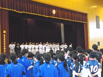 県総体に出場する部の挨拶を終え、部員と一般生徒がステージに注目し、幕が開き、そこには野球部員の姿がありました。キャプテンによる、校歌一番の独唱、続いて、校歌二番を他の野球部員が歌いました。最後にもう一度、全校生徒で一番、二番を斉唱しました。県総体壮行会での部員からの熱いメッセージや、前段の独唱による高揚感でこれまでにないほどの大きな声が体育館一杯に響き渡りました。
