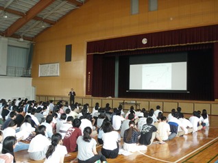 本日4限目、3年生を対象に体育館で進路講演会を行いました。講師に駿台予備学校の高橋幸広さんをお招きし、「第一志望は、ゆずれない」というテーマで話をしていただきました。