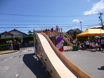 正門をくぐると、「門」が来校いただいた方々をお迎えします。今年度、「門」を担当したのは、2年6組。従来の門と、ジェットコースターらしきアトラクションを組み合わせた、斬新なアイデアの門。高さ2.5Mぐらいから滑り落ちます。