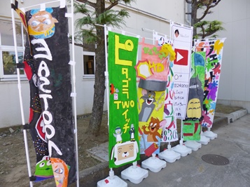 続いて、各クラスの「のぼり旗」。クラスの出し物を旗に書き記しているクラスが大半です。3年生は食品バザーの宣伝も兼ねています。