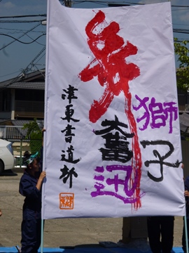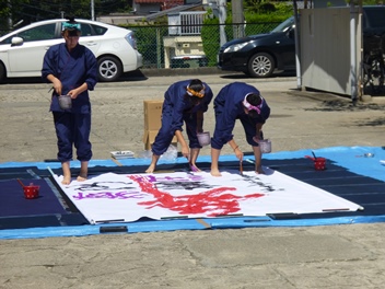校舎正面では書道部の書道パフォーマンス。「舞 津東高等学校」の見事な字が書き上がりました。