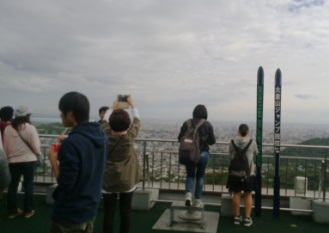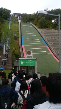 というわけで、7・8組で大倉山シャンツェに来ています。ちょっと風はありますが、極端に寒すぎるわけでもなく、絶景を楽しみました。下から見ても高さに驚いていましたが、リフトで上に上がると更なる高さに震えている生徒もいました。