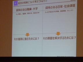 「子どもたちの65%は今、存在していない仕事に就く」というキャシー・デビットソンの言葉を引用し、社会の変化がこれまで以上に早く、激しいことから、「進路についてどのように考えるか」について説明を受けました。 これまでは「なりたい職業」から学問分野を考えました。これからはこの考え方に加え、自分が興味関心をもつ「日常・社会の課題」から「課題解決に繋がる学問」を考えることの重要性について話しがありました。