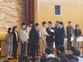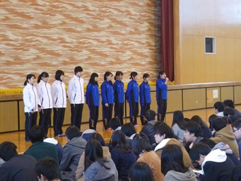先週、金曜日から始まった2学期末考査も5日目の本日が最終日。試験を終え、全校生徒が体育館に集まり、表彰伝達式、壮行会、生徒会役員交代式などを行いました。