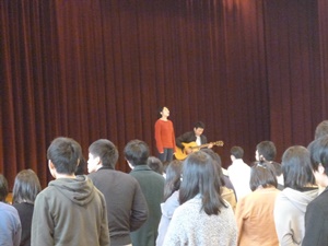 続いて、12月17日、愛知県知多市で開催されるフェンシング東海新人大会に出場するフェンシング部女子団体の壮行会に移りました。この大会は団体のみで、東海4県中、上位2位に全国大会への出場権が与えられます。本校、フェンシングはエペ、サーブル、フルーレの3種目いずれにも出場します。 松岡校長からの激励の言葉に続き、今年6回目となる校歌独唱。今回はこれまでのピアノ伴奏ではなく、ギターによる伴奏。ロッキン部の生徒による校歌の一・二番の独唱と演奏の後、、全校生徒も同様に一・二番を歌いました。
