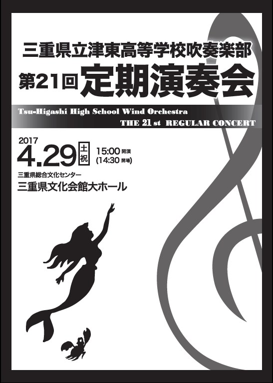 演奏曲目:スピリテッド・アウェイ≪千と千尋の神隠し≫より マーチ・シャイニング・ロード(今年度吹奏楽コンクール課題曲) ミュージカル「リトル・マーメイド」 ヒットメドレー2016 ほか 津東高校名物、恒例のミュージカルは「リトル・マーメイド」を上演します。 現在の3年生にとっては、全員で演奏する最後の機会になります。 ぜひお越しください。