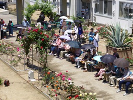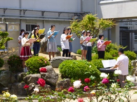 本日11時から、公開しているバラ園で合唱部によるミニコンサートを開催しました。今年話題になった曲や、本校の校歌を作っていただいた作詞家の阪田寛夫さんと、作曲家大中恩さんの曲など6曲の歌を披露しました。5曲目は熊本地震復興のための応援ソング「ふるさと」でした。遠くのことで忘れがちになる災害ですが、地元の方々はまだまだ大変な生活を強いられています。一日も早い復興を願って、来ていただいた方々と一緒に歌いました。 今年は学校行事の関係から、2期に分けて公開したバラ園ですが、多くのマスコミ二取り上げていただいて、本日のミニコンサートも大変多くの方に来場していただきました。PTAの役員の方に受付や駐車場の整理も手伝っていただき、スムーズに開催することができました。本日一日だけで349名、6日間で述べ883名の方に来ていただきました。ありがとうございました。