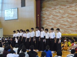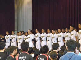 出場するクラブの挨拶が終わると、部員も振り返ってステージに注目します。緞帳が上がるとそこには、昨年度と同じように野球部員の姿がありました。キャプテンによる、校歌一番の独唱、続いて、校歌二番を野球部員全員で歌いました。最後にもう一度、全校生徒で一番、二番を斉唱しました。ステージ上の野球部員の声につられて他の生徒たちも声が出て、体育館一杯に大きな歌声が響き渡りました。