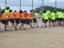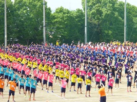 開会式の後はラジオ体操、各クラスで揃えた色とりどりのクラスTシャツが、きれいに並びました。100mのような個人種目も盛り上がりますが、女子綱取りや男子騎馬戦、クラス代表リレーなど団体種目の方が、団結力も加わってさらに盛り上がりました。その締めくくりが体育祭最終種目の大縄飛びです。始業前や昼休みに練習をしても、なかなか飛ぶ回数が増えなかったクラスも、本番は気合いが入ります。クラスによっては円陣を組んでかけ声をかけ、挑戦していました。その結果、最高は1年8組の48回でした。この大縄跳びも含め、全種目での総合順位では、3年2組が優勝となりました。