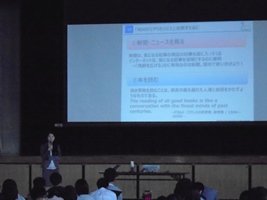 1年生は、ベネッセコーポレーション初等中等教育事業本部の荻原香織さんを講師にお迎えし、講演をしていただきました。なりたい職業だけでなく、興味のあることから進路を考えると幅が広がりますます。そのためには、高校時代に自分の軸となる興味関心を見つけることが必要です。と言うものの、なかなか見つけるのは難しいと思います。その時は、1年後あるいは5年後、どこで誰とどう過ごしていたいかを想像し、そのために自分にできることを一つ一つ頑張って欲しいという講師の方からのメッセージでした。