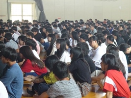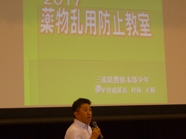 今年度は6月15日(木)、7限目、総合的学習の時間で全校生徒対象に、体育館で行いました。三重県警察本部から、生活安全課の村林さんに講師として来ていただきました。