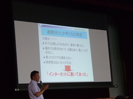 まず最近の傾向として、青少年の間では覚醒剤より大麻の使用の方が増えていることが、紹介されました。その理由として、インターネットで「@大麻は体に悪くない、A海外では許可されている国もある、B使っただけでは捕まらない、C依存性はない」といった、情報が流れているからということでした。