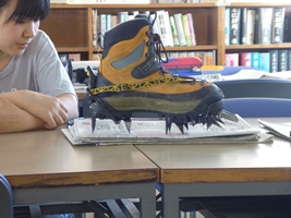 会場には登山専用の靴やスキー、道具類なども展示していただき、使い方も説明してもらいながらの講演でした。本格的な山に登るのは難しそうですが、この講演で、少しでも山に興味を持ってくれる人が増えてくれたらと思いました。