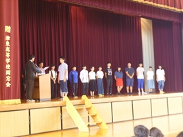 終業式に先立って、先週行われたクラスマッチの表彰式を行いました。梅雨の最中でしたが、3日間とも屋外競技を中止することなく、実施できました。結果は3位が3−7、2位が1−2、1位が3−2でした。お疲れ様でした。