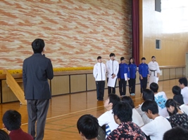 次に部活動で結果を残したクラブと個人の表彰伝達式を行いました。県総体の団体ではフェンシング、新体操、バドミントン、ハンドボール、山岳の各部、個人ではフェンシング、新体操、陸上、ハンドボールで活躍した選手と、「おーいお茶新俳句大賞」で特別賞を受賞した生徒が表彰されました。 続いて、全国総体に出場するクラブと個人の壮行会を行いました。今年は空手とフェンシングが出場を決めています。空手は福島県、フェンシングは宮城県で行われます。日頃の練習の成果を、是非発揮してきて欲しいと思います。