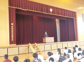 式の後は、生活指導部からは諸注意がありました。携帯電話や通学、服装のマナー違反について、さらに夏休み中の過ごし方についても説明がありました。見つからなければ良い、事故に遭わなければ良いと考えるのではなく、高校生としての自覚を持って生活して欲しいものです。
