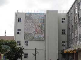 南館の壁には、モザイクアートの作品が展示されました。紙でできているだけに、雨や風が心配されましたが、晴天に恵まれてその心配もなくなりました。体育館の前ではダンス部が、門の後ろでは書道部がそれぞれパフォーマンスを行い、観客の皆さんから盛大な拍手をいただいていました。