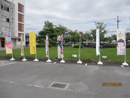 続いて、各クラスの「のぼり旗」です。クラスの出し物を表現しています。フエルトや綿を使って半立体にしているクラスもありました。3年生は食品バザーの宣伝も兼ねています。