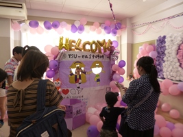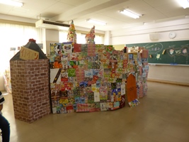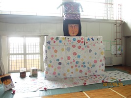 お菓子の包み紙だけでお城を作ったクラス、5000枚以上の紙を貼り合わせたモザイクアートでトトロを描いたクラス、大量の風船で教室を飾り付けたクラスなど、様々でした。また、体育館には「メガ幸子」と称し、担任の先生の巨大モデルを作り上げた作品も展示されていました。 クラス企画の最後ステージ発表。